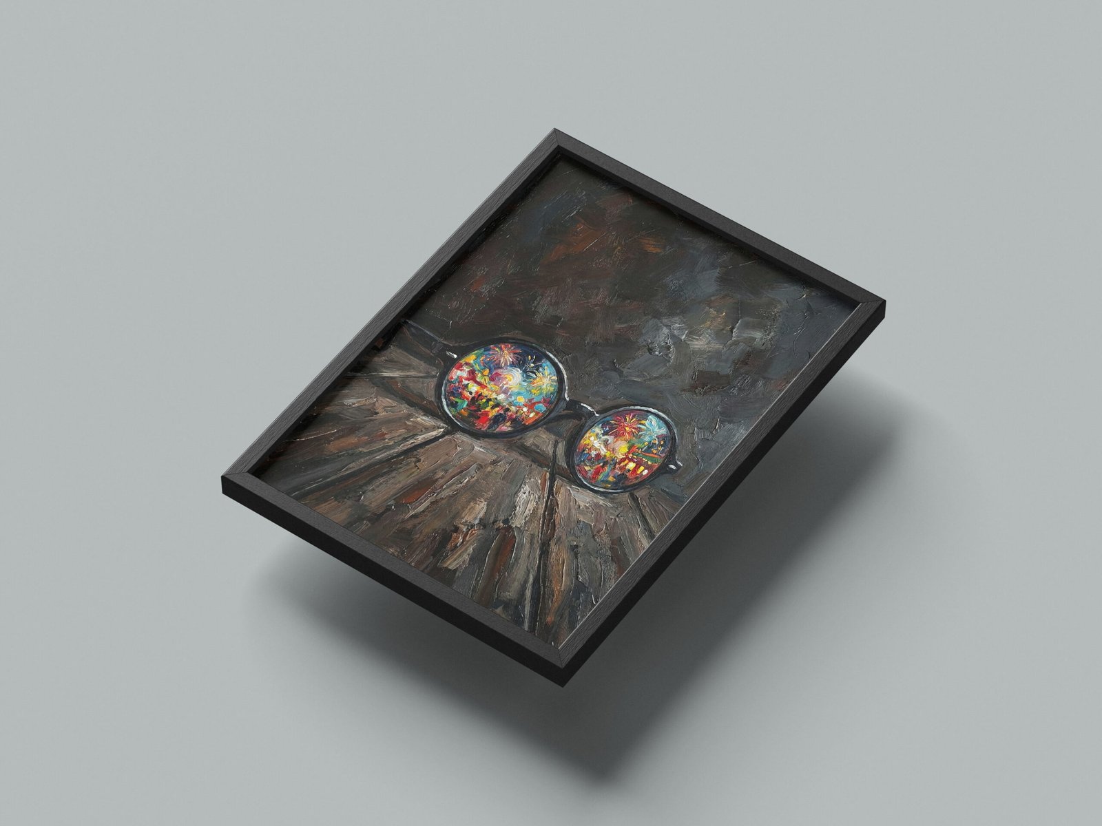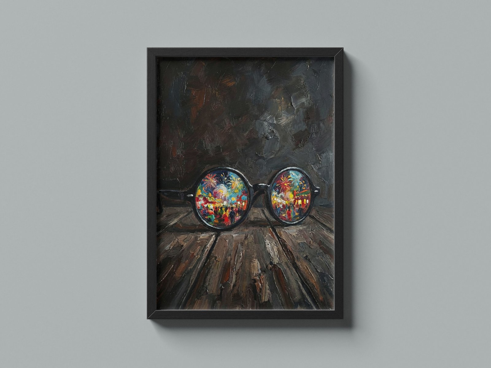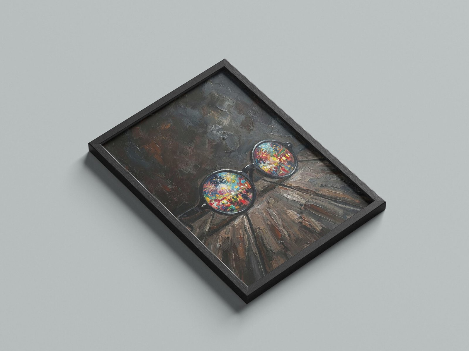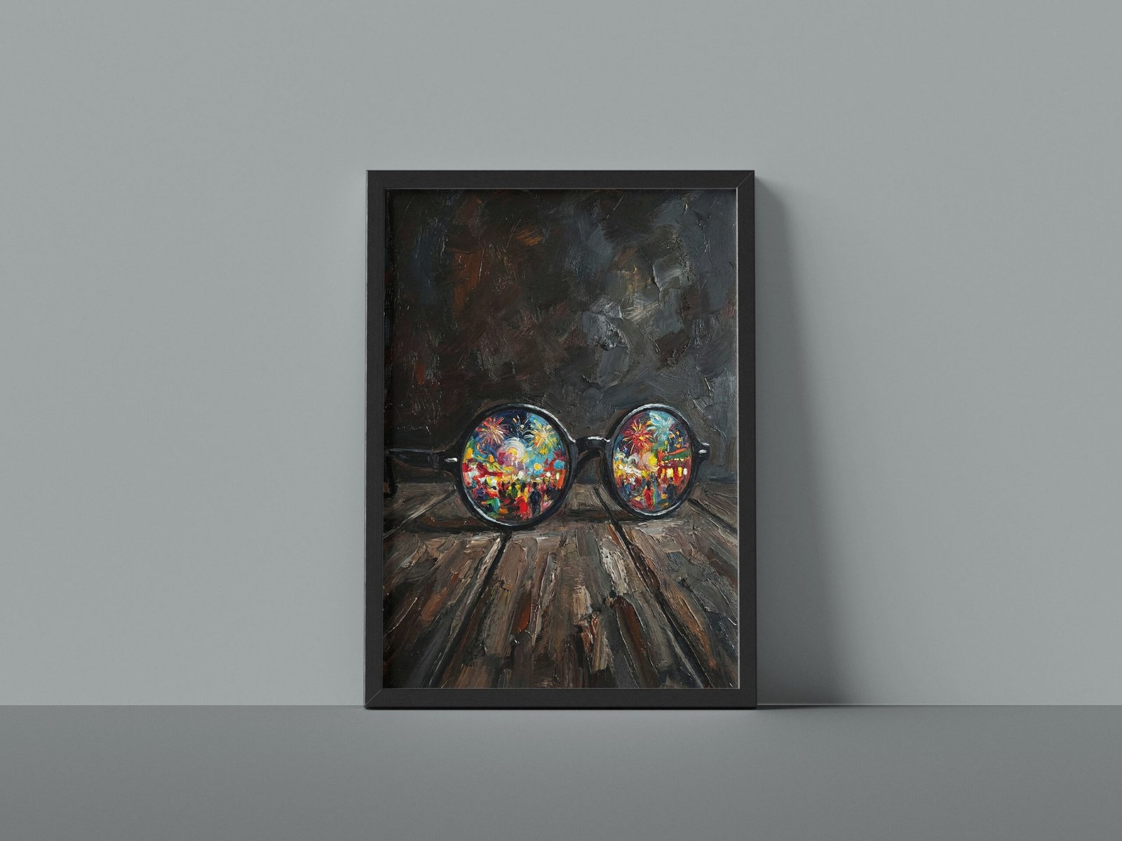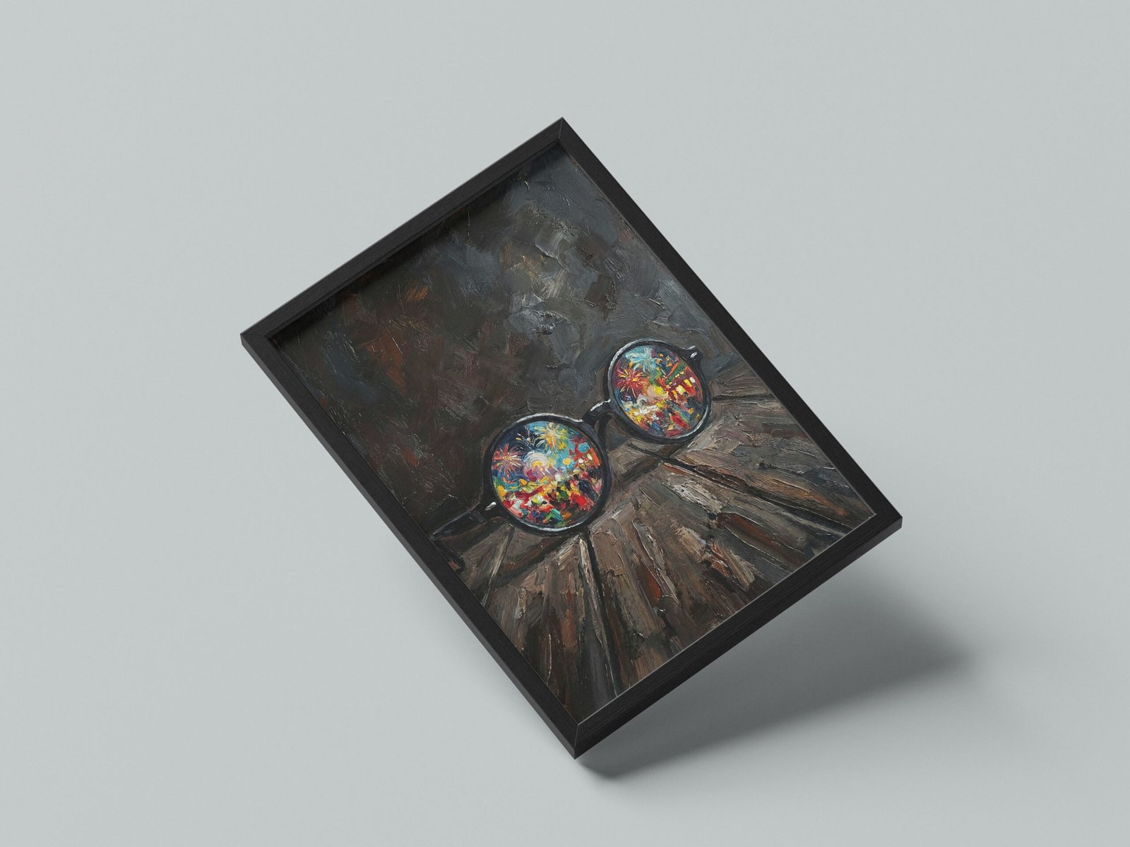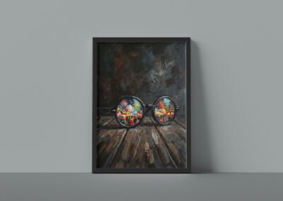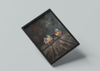 على خشبٍ داكنٍ يختزن آثار الزمن، تستقرّ نظّارةٌ مستديرةٌ كأنها تُركت بعد لحظة صمتٍ طويلة، غير أنّ العدستين لا تعكسان العتمة، بل تكشفان عالماً يفيض بالألوان والحياة.